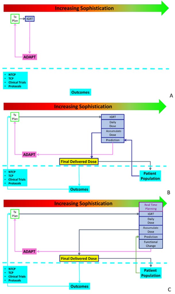Increasing levels of sophistication in adaptive radiotherapy, ranging from simple IGRT-based replanning (A) to DIR-based dose accumulation and the development of predictive models tied to an outcomes database (B) to online replanning and functional guidance (C). DIR, deformable image registration; IGRT, adaptive image-guided radiotherapy [3].